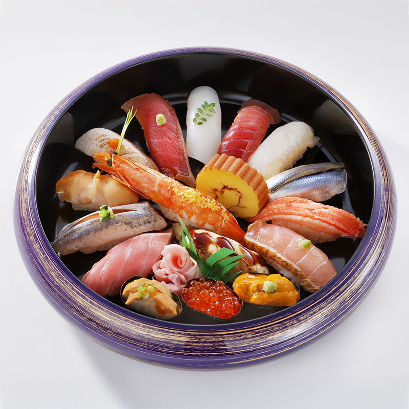 内容:左下から大とろ、五島灘の真鯵(またはイワシ)、赤貝二杯酢漬け、ぶりの炙り、特製づけ鮪、甲いか、中とろ、熟成平目、江戸前小肌、ずわいがに、焼き霜鮪にんにく醤油漬け、煮穴子の炙り、大海老、伊達巻玉子、当日のお勧め握り(写真はあん肝)、いくら醤油漬け、特選生うに【17種17カン】
