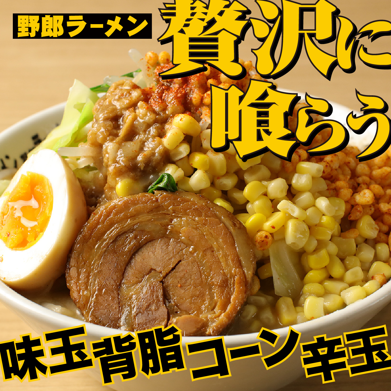 大人気野郎ラーメンに「スイートコーン」「漬け味玉」「自家製背脂」「特製辛玉」を載せた贅沢な1品。いつもの野郎ラーメンでは満足できないお客様へ、デリバリー限定商品です!
